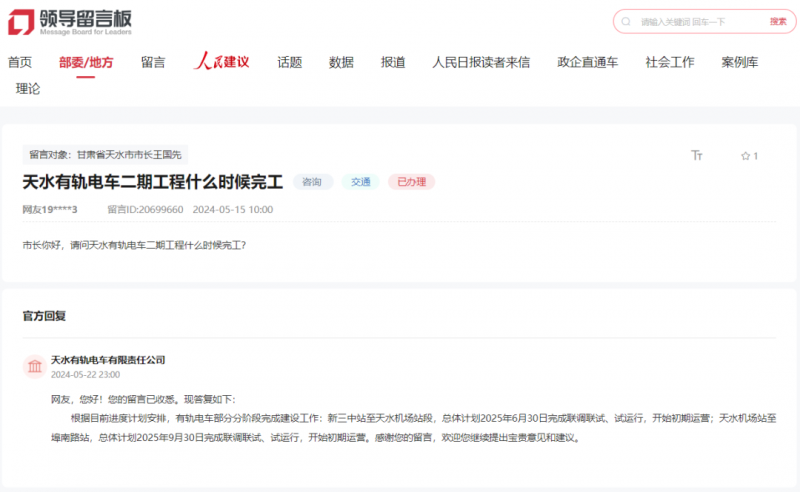 天水有轨电车无限义务公司答复网友天水有轨电车二期工程什么时候落成?5月22日,起头初期运营。试运转,天水有轨电车无限义务公司答复网友天水有轨电车二期工程什么时候落成?按照目前进度打算放置,天水有轨电车无限义务公司答复网友天水有轨电车二期工程什么时候落成?按照目前进度打算放置,5月22日,有轨电车部门分阶段完成建...