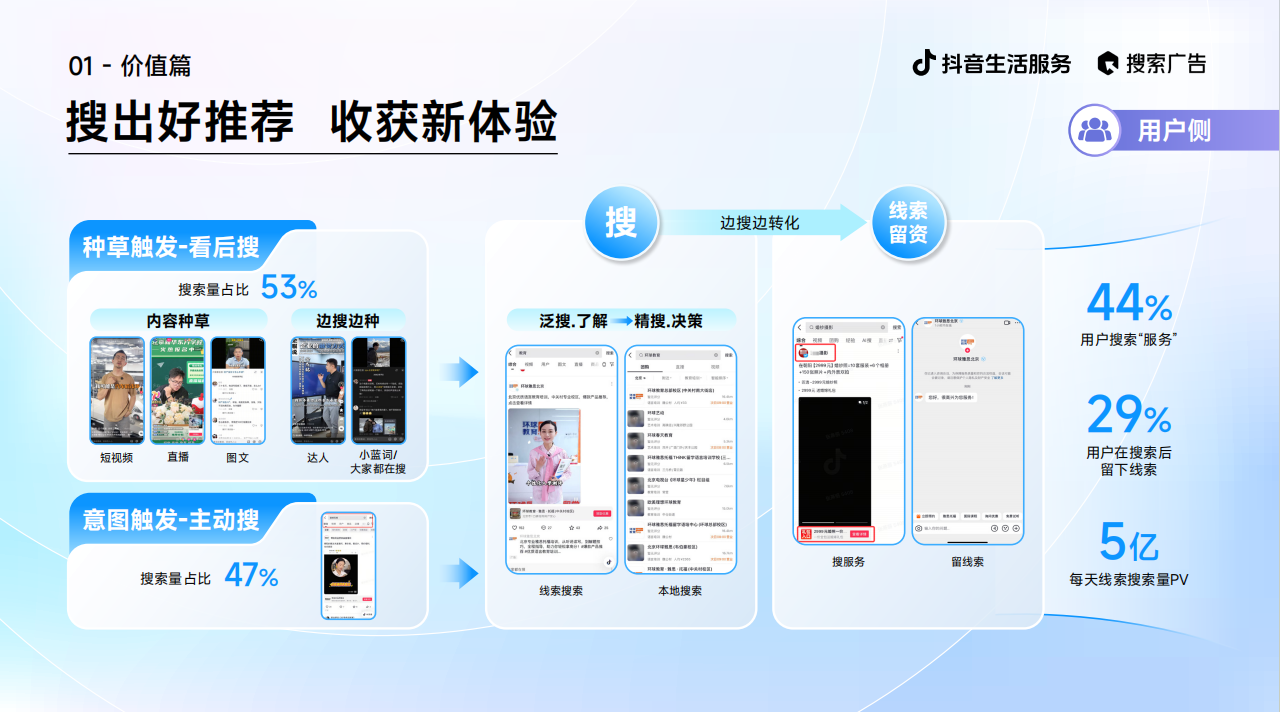 搜刮用户需求更明白、企图更强烈,抖音平台日均5亿次的用户搜刮量彰显出庞大的贸易活力,获取体例于文末展现!CVR提拔74%、CTR提拔16%、率提拔102%,降低决策成本。线%,《2025抖音糊口办事搜刮告白投放指南(线索版)》不只是一份简单的投罢休册,高频用户行为和海量搜刮数据背后,52%的抖音用户有搜刮行为,现在,实现告白平均生命周期长达14天?
